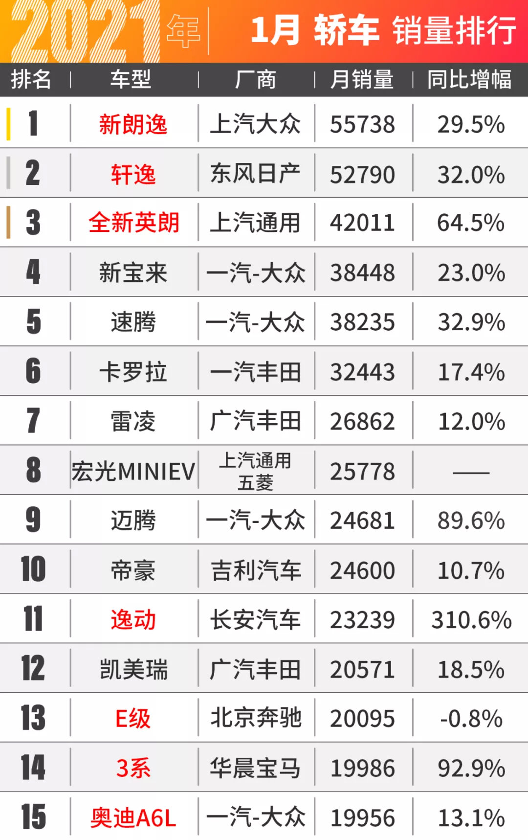 2021年开年,轿车市场就迎来了一次洗牌,大众朗逸凭借着55738台的销量重回巅峰,相比去年12月销量上涨了9000台!看来,对于大部分消费者来说,回家过年开一辆大众还是要更高级的!