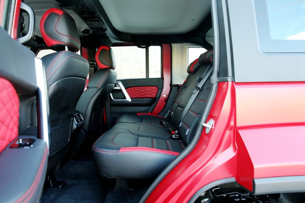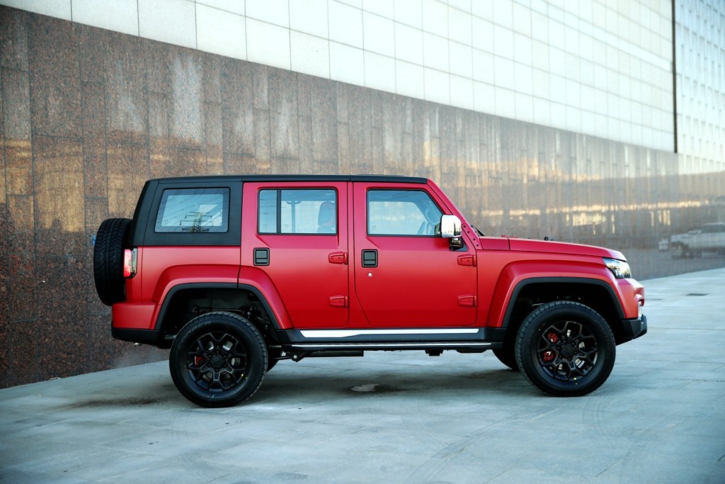 来到车侧,横平竖直的轮廓,车门铰链外露,以及可拆卸车顶,均是BJ40的个性标签。此外,17英寸多条辐轮圈也做了熏黑处理,搭配红色刹车卡钳涂装使得视觉效果更具力量感。