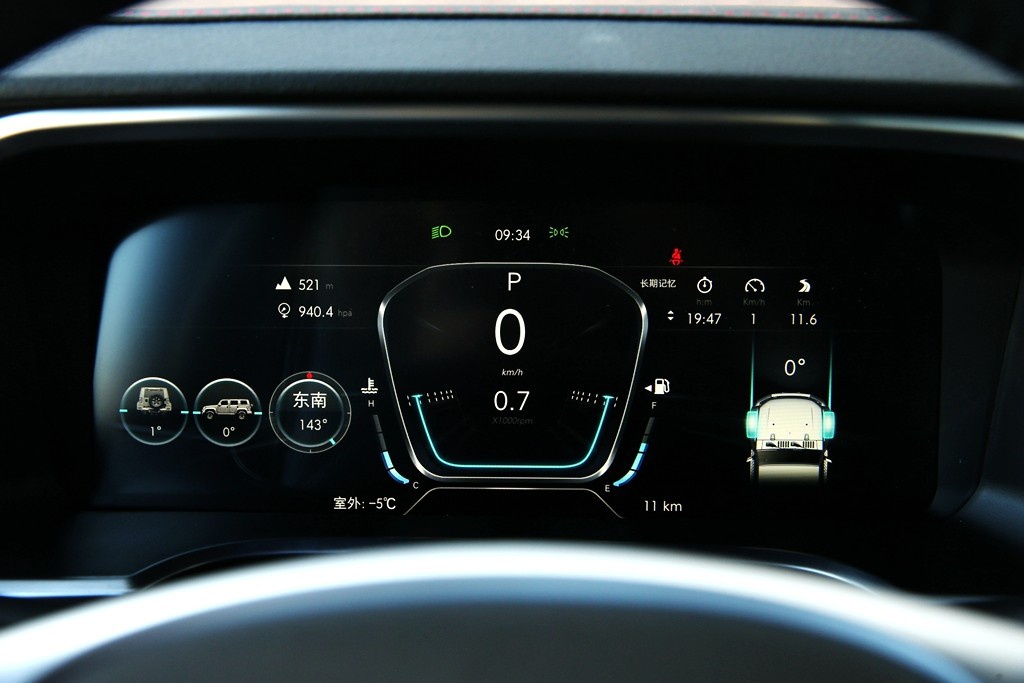 全液晶仪表之上还能够显示车轮转向角度、侧倾角度以及俯仰角度等相关越野信息。
