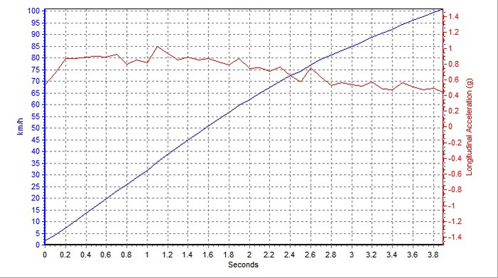 从PBOX收集到的数据上来看,电机瞬间全功率输出的特性为Model 3高性能版的起步帮了不少忙。在起步的瞬间,整车G值就已经超过了0.6g,随着四轮抓地力渐入佳境,车辆G值也在迅速攀升,最高达到了1.125g,比自由落体的g值还要更大一些。而在加速的后半程,虽然g值有所下跌,但也保持在了0.4g以上,推背感十足。
