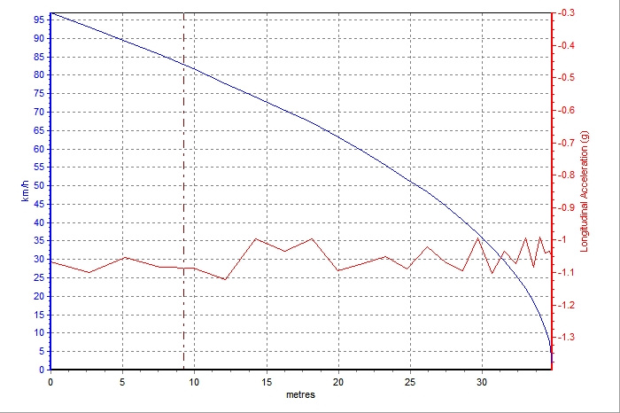 所谓跑得快也要刹得住,特斯拉Model 3高性能版的刹车表现无疑是非常让人期待的。经过了多次测试后,最好刹车距离为37.09米,表现中规中矩。具体来看,Model 3高性能版在跺下刹车踏板后,刹车力度释放非常均匀,g值基本上保持在-1左右。总的来说,Model 3高性能版的刹车绝对实力并不算特别优秀,但稳定性还是能够让人放心的。