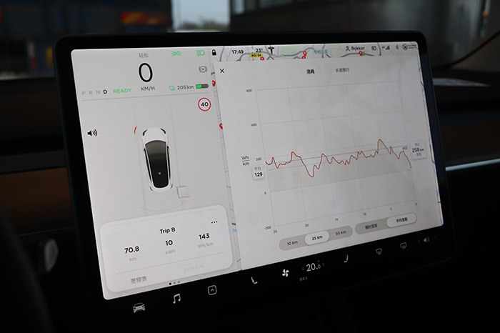 紧接着,我们又将车开上了繁忙的广州道路及高速公路,看看在日常通勤的情况下特斯拉Model 3高性能版的电耗情况是否能够让人满意。在此次测试过程中,我们选择了尽可能模拟车主的驾驶习惯进行行驶,必要的超车、刹车从不含糊,空调调至22℃,音乐也正常进行播放。