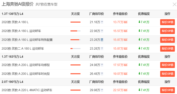 问题的话,奔驰A级就是起步慢而且座椅不舒服,另外换挡不平顺、车内隔音效果不好也是其问题所在,希望后期能够加以改善。好在奔驰A级现在在上海地区最高拥有7.41万的优惠,算下来之后最低配车型只要13.77万元,因此优惠真心可以说是很高了,适合小年轻们去入手。