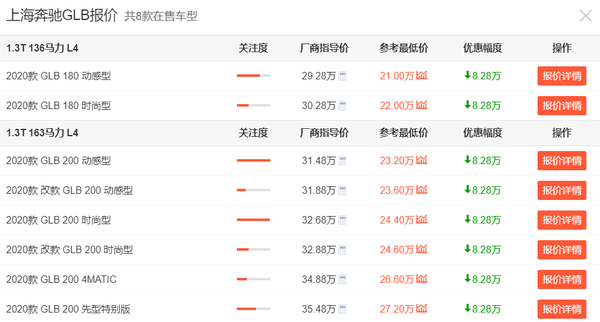 具体来看,全系1.3T发动机的奔驰GLB指导价是29.28-34.88万,目前参考最低价来到了21.00-27.20万区间,最高优惠8.28万元。从北京奔驰对GLB价格的妥协我们能看出,其实奔驰也不是没有降价可能的,重点还是要看国人购买的热情啊。还是那句话,你不买、我不买,奔驰它就得降价。至于不足,GLB普遍存在发动机噪音大、座椅不舒适、后排不舒适、车内隔音效果不好等问题,希望厂家能够加以改善。