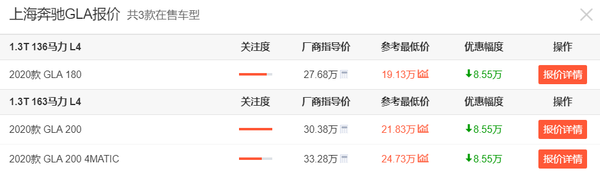 奔驰GLA是一款上市不久的全新紧凑型SUV,作为换代车型,这代GLA的外观内饰有着很大的争议,所以目前从终端来看,GLA的销量表现并不可观。动力上,这代奔驰GLA搭载了一台1.3T发动机,最大功率只有136马力和163马力,孱弱的动力表现或许也是网友们对这款车不待见的地方,毕竟它的售价起步就来到了27.68万元区间。