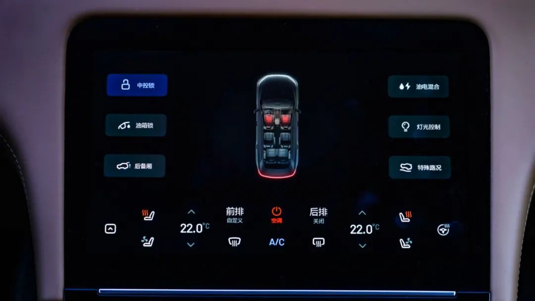 下方中控屏为行车常用操作控制区,空调、座椅加热、通风、方向盘加热、中控锁、油箱锁、灯光等等。