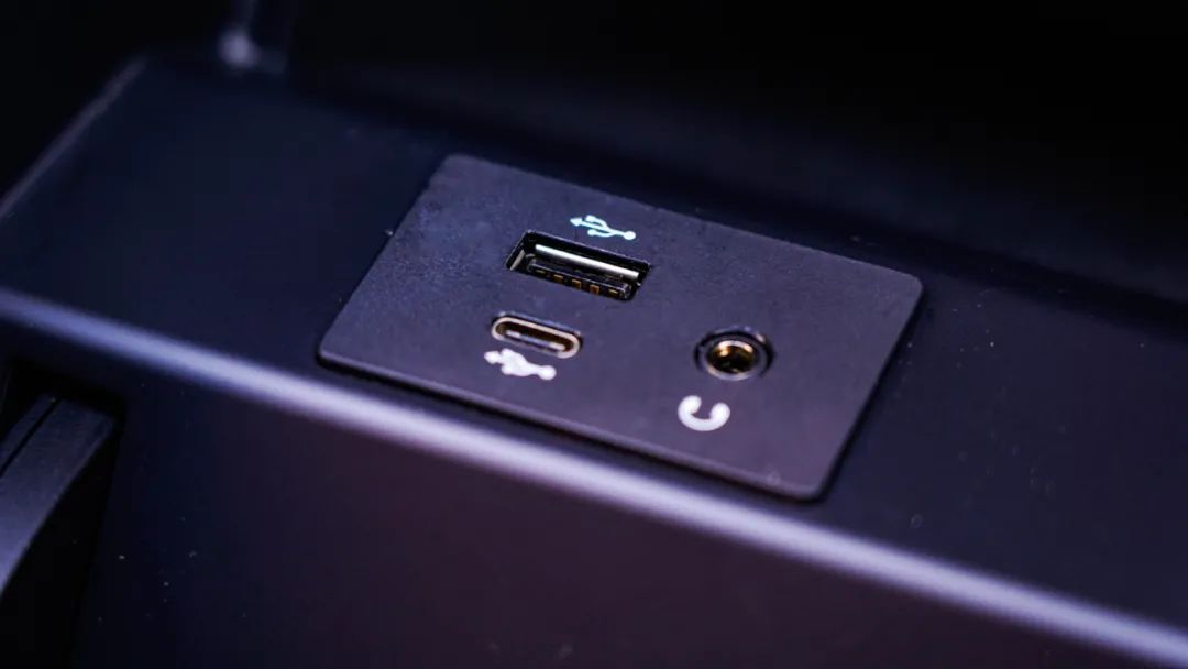 中央扶手箱USB-A,USB-C两个充电接口。3.5mm耳机接口,插上之后副驾可独自享受娱乐系统的音频内容,避免打扰司机。
