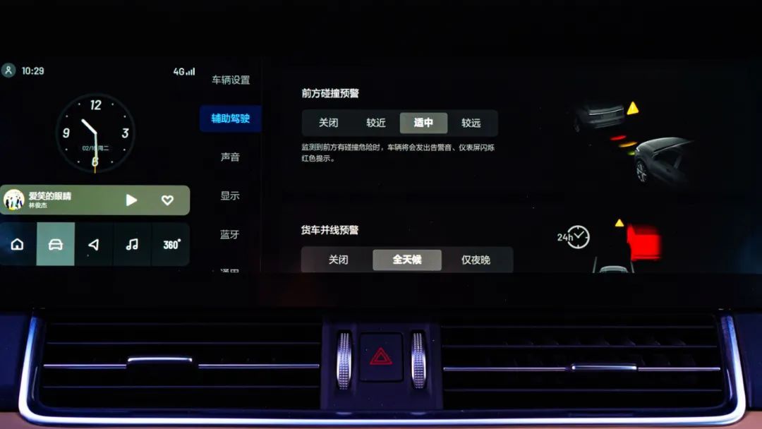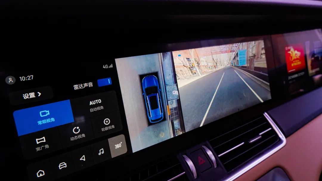 上方中控屏可进行车辆设置,全屏展示导航信息,倒车影像、360环影都在这里。