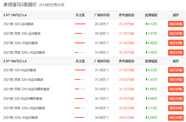 看到价格,目前宝马3系的指导价是29.39-40.99万,整体我觉得还算合理。不过可能是由于3系上市已经有一段时间,所以目前3系的参考最低价也来到了25.26-35.20万区间,优惠最高可达5.79万元,总体来说还是具有一定性价比的,至少比刚上市那会划算。不足的话,3系就是存在内饰异味大、胎噪大、低速顿挫等问题,因此希望厂家在这点上也能够加以改善。