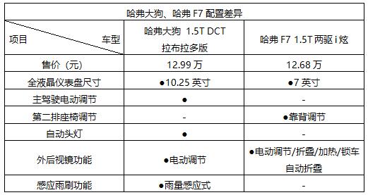 哈弗品牌向来在配置方面表现厚道,因此中低配车型甚至是入门级车型都可以入手。对于哈弗大狗和哈弗F7,主销车型基本上都在12-13万元,因此,我们不妨以12.99万元的哈弗大狗 1.5T DCT拉布拉多版和12.68万元的哈弗F7 1.5T两驱i炫为例,来看看两车的配置差异。