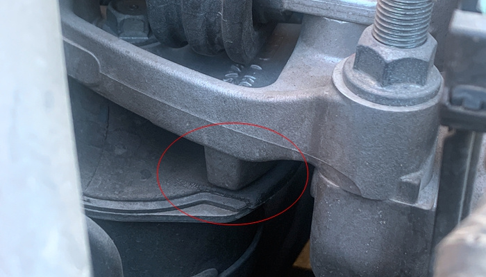 右前机脚胶是八代思域的常用“耗损件”,由于设计及材料的因素,导致了所有八代思域在行驶4万公里(或者两年左右)后,右前机脚胶就会耗损完毕,像红圈中的金属限位器直接硬碰硬地与橡胶底座碰撞。
