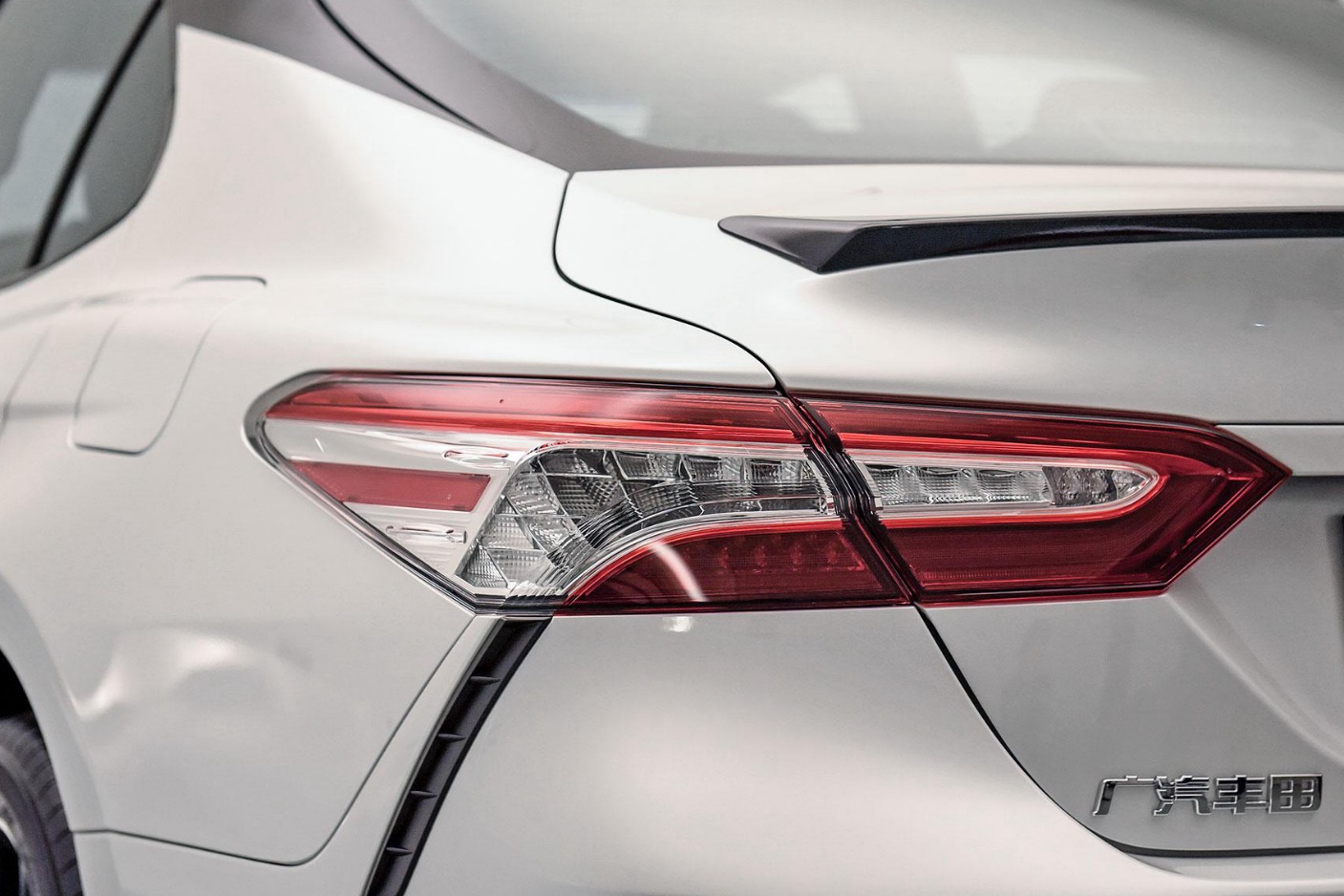 车尾同样延续老款车型设计,主要变化体现在尾灯上,延长了电镀铬装饰条,并在侧面增加了红色装饰条,中间带有"CAMRY"英文标识,看起来更加动感。此外,运动版车型采用了更运动的双边共四出排气管。