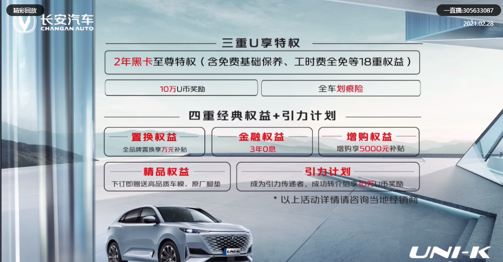 2月28日,长安UNI-K正式开启预售。新车共推出4款车型,预售价区间为15.79万-18.89万元。优惠政策方面,长安汽车提供了三重U享特权及四重经典权益+引力计划,购车用户可享受两年黑卡至尊特权(含免费基础保养、工时费全免等18重权益),提供全车划痕险、10万U币奖励、置换可享至高万元补贴、享受3年0息金融权益、增购可享5000元补贴、下订即宋高品质车模+原厂脚垫,详情参见下表。