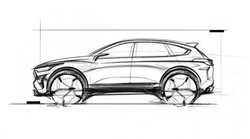 首先是侧面,这是我认为最容易引起遐想的地方。在官方的设计图上,可以看到车尾采用了一个类似轿跑SUV的曲线。但相对于轿跑SUV来说车顶线条下压的幅度不算大,在车顶和后风挡结合的地方用圆弧来处理,过渡比较舒服。