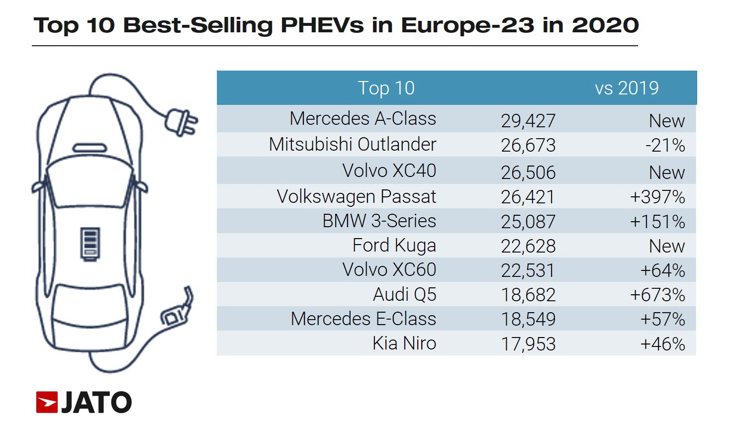 再看PHEV领域,三菱欧蓝德PHEV经过多年霸榜之后,终于在2020年被梅赛德斯-奔驰A-Class(A250e)取代,以26,673辆退居第二名。奔驰A250e则卖出了29,427辆,而是这还是2020年新投放的车型,表现不俗。
