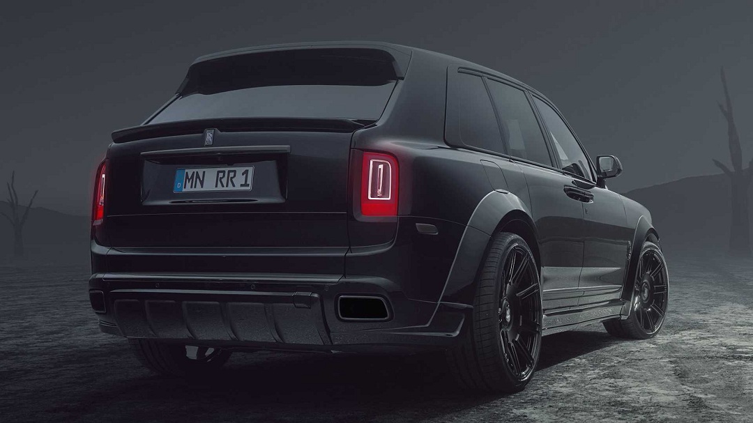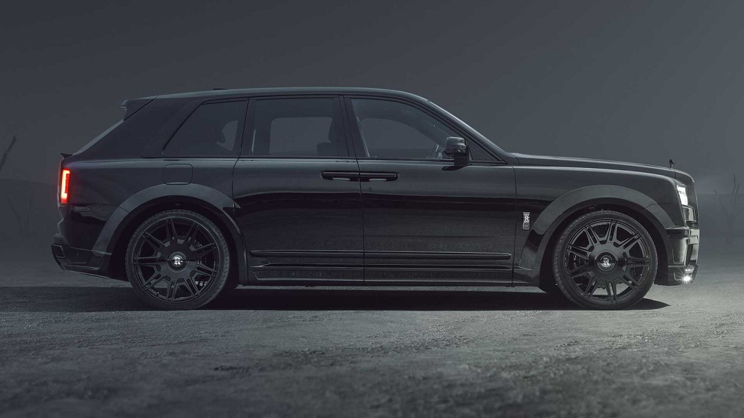 车身侧面,新车基于劳斯莱斯库里南Black Badge版本打造,整车黑化的外观看上去神秘感十足。并且,Spofec还给车身增加了一圈包围,其中包括前后保险杠和车身侧裙,经过改装后的车辆看上去视觉效果更长。同时,两侧24英寸锻造轮圈搭配明显外凸的轮拱,也进一步提升了整车的运动属性。