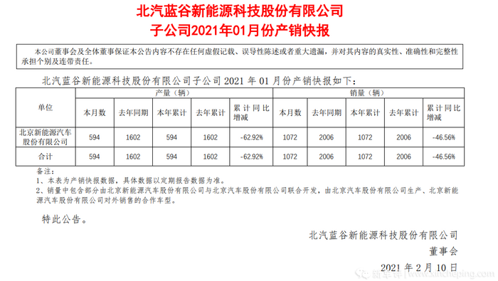 去年的一月份因为春节和新冠疫情的影响,导致汽车产销都陷入了低谷,引致今年一月份不少汽车品牌都出现了超高的同比产销增长。但凡事总有例外,北汽蓝谷(北汽新能源)一月份产销数据显示,产量仅为594辆,同比下跌62.92%,销量为1072辆,同比下跌46.56%。