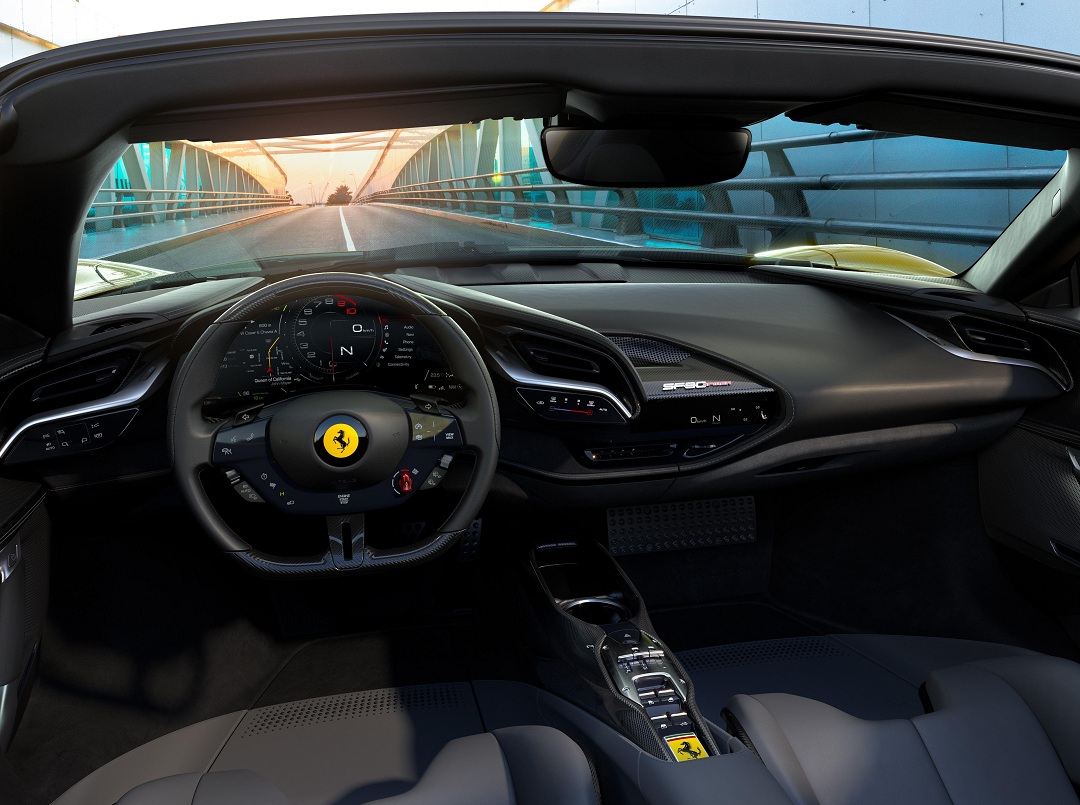 车内部分,新车采用三辐式碳纤维平底方向盘设计,并且方向盘上的控制键也均为触控式设计,使其更有科技感。同时,在仪表台以及中央控制区也都使用了大量碳纤维材料进行包裹,在仪表台上方还印有“SF90 Spider”字样,突显了其车型版本身份。