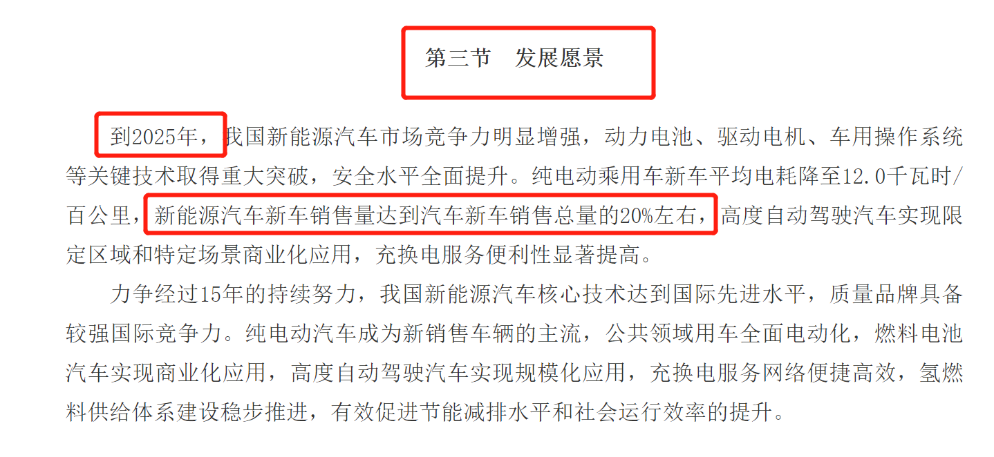 在《关于印发新能源汽车产业发展规划(2021-2035年)》中指出:到2025年,我国纯电动乘用车新车平均电耗降至12.0千瓦时/百公里,新能源汽车新车销售量达到汽车新车销量总量的20%左右。