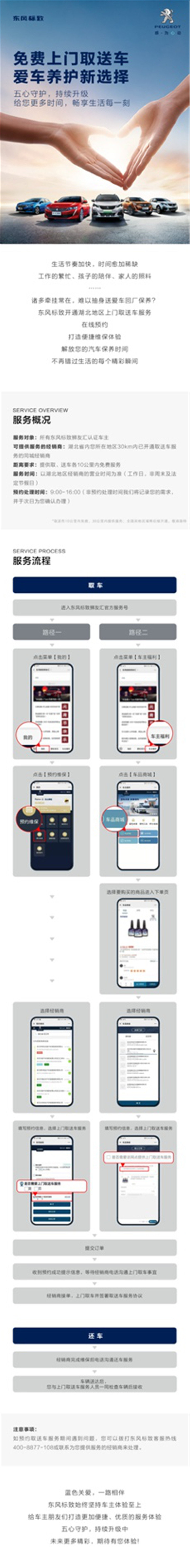 东风标致“上门取送车服务”于 3月1日- 3月31日在湖北区域展开试点,为所有东风标致狮友汇认证车主提供同城30公里内取送车服务,其中取、送车各10公里内免费提供服务。通过狮友汇服务号,指尖一点,客户线上预约即可便捷体验,轻松享受上门取送车服务。节省客户维保时间,为客户安全出行提供更加便捷的服务保障。