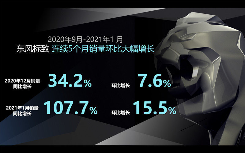 神龙公司和东风标致对中国市场和客户需求的快速响应和满足,使得如“五心守护”行动等系列积极扎实的举措产生了显著的效果。2021年1月份,东风标致实现销量同比增长107.7%,环比增长15.5%的成绩。不仅保持了自去年9月份以来连续五个月的环比正增长,更是保持了去年12月份以来连续同比正增长的势头。