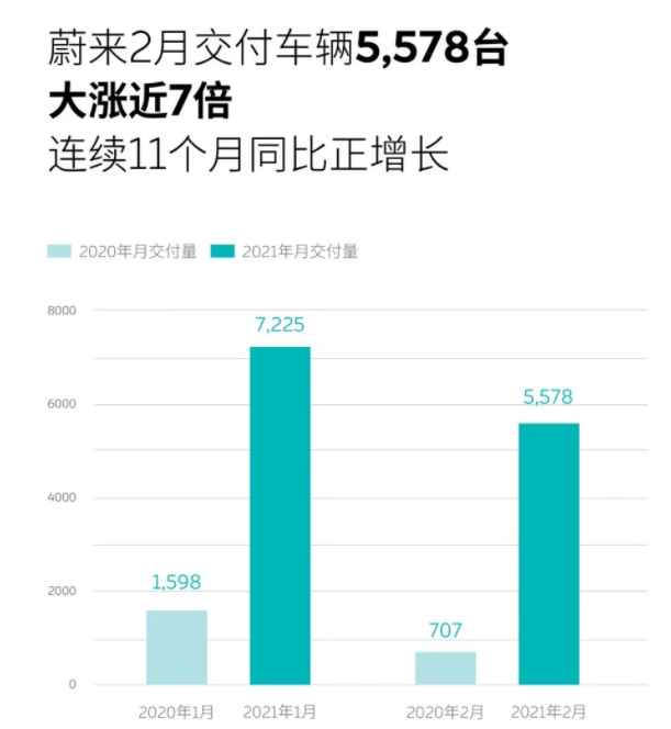 首先,从上表中可以看到,蔚来汽车在2021年2月共交付5578台新车,和1月份7225台相比,环比下降22.8%,虽有所下滑,但起码数据上要比其理想和小鹏好看很多。