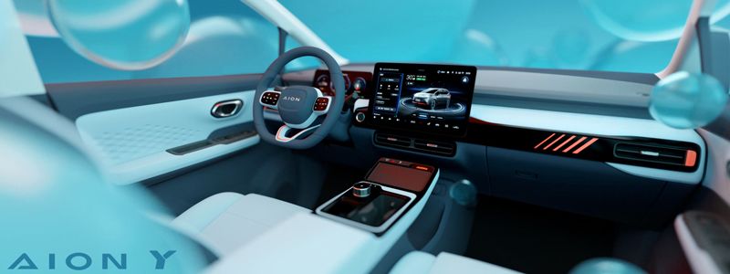 内饰方面,AION Y采用大量圆角矩形元素,整体设计非常简洁。中控台取消大量实体按钮并加入平底三辐式方向盘、液晶仪表及大尺寸悬浮式中控屏,配合多处出现的橙色点缀,时尚与科技风格浓郁。
