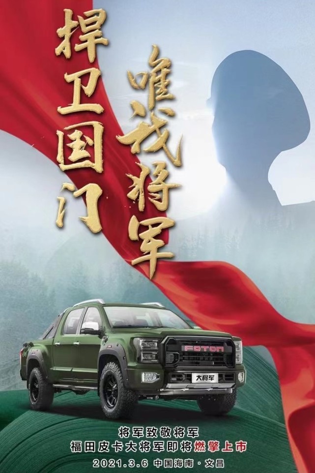 日前,我们从福田汽车官方获悉,福田大将军 (配置|询价)皮卡将于3月6日正式上市。据悉,新车已于2020北京车展期间正式亮相并同步开启预售,其预售价为12.98万-18.38万元。此外,新车将推出休闲版、运动版、越野版三种外观风格车型,以及2.0T汽油、2.0T柴油、2.5T柴油三种动力组合可选。