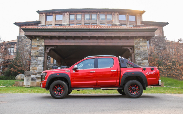 车身侧面,新车采用标准的皮卡车身造型,视觉上十分魁梧。新车采用大量硬派越野元素设计,包括前后翼子板上大幅向外突出的黑色铆钉宽体、车顶行李架、后车厢全尺寸龙门架、红黑双色多辐条轮圈,都使得整车外观更具硬汉气质。