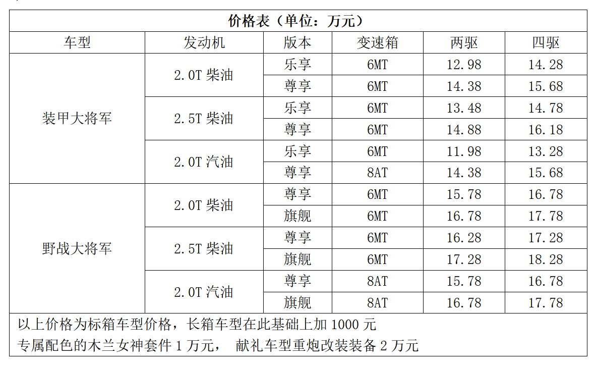 3月6日,福田汽车正式发布了旗下全新皮卡——福田大将军 (配置|询价),新车共推出装甲大将军、野战大将军、木兰大将军、重炮大将军等车型,售价区间为11.98万元-18.38万元。