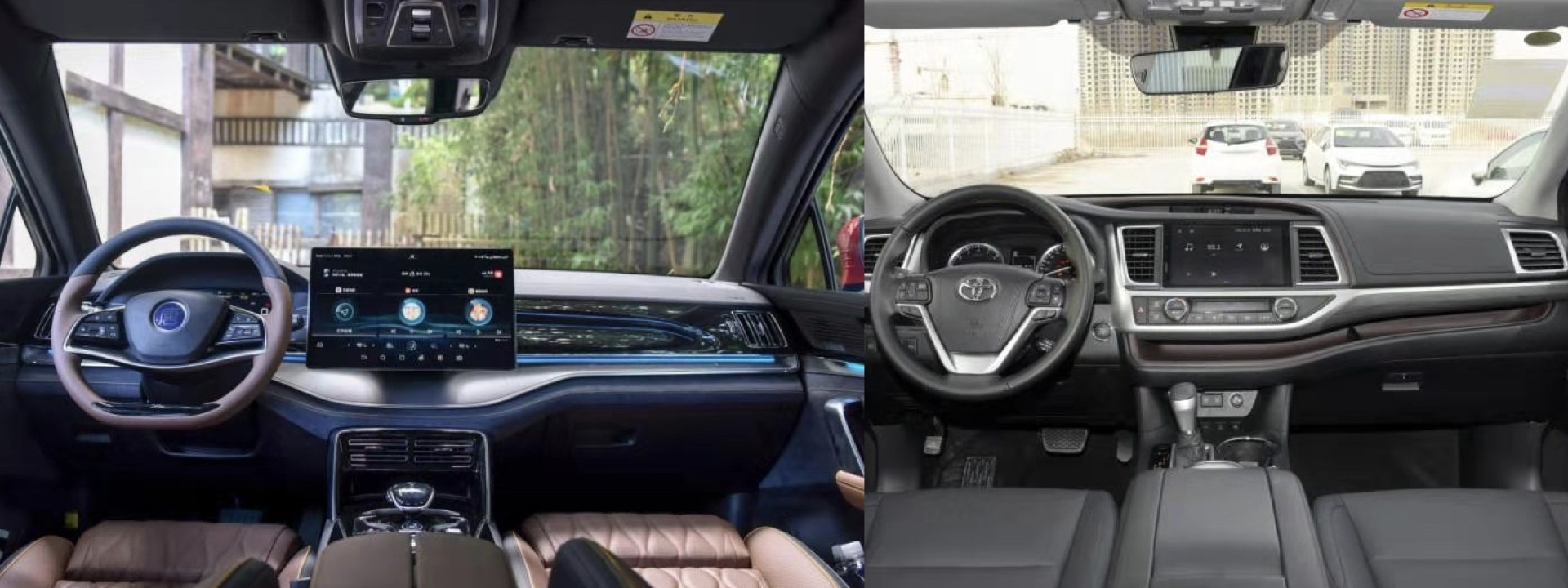 2021款唐DM整体内饰格局比较有环抱感和层次感,31色氛围灯、来自北欧的与劳斯莱斯同技术的Dirac高保真声学科技,更易沉浸其中。大面积采用了经常在豪华跑车上见到的奥斯维高档类麂皮面料,触感细腻柔软,加宽加长的座椅、主副驾的腿托设计,驾乘都十分轻松舒适。而汉兰达,整体来说算不上多么精致,甚至有些沉闷,内饰很简洁,满足基础功能操作。在空间尺寸上,唐DM也是更胜一筹。