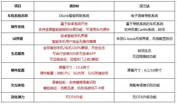 唐DM (配置|询价)搭载DiLink智能网联系统,具有开放的生态优势,智能化程度更高,可远程无限升级,让用户直接获取最新技术,让爱车“常用常新”。而汉兰达的车机系统就比较常规和封闭。