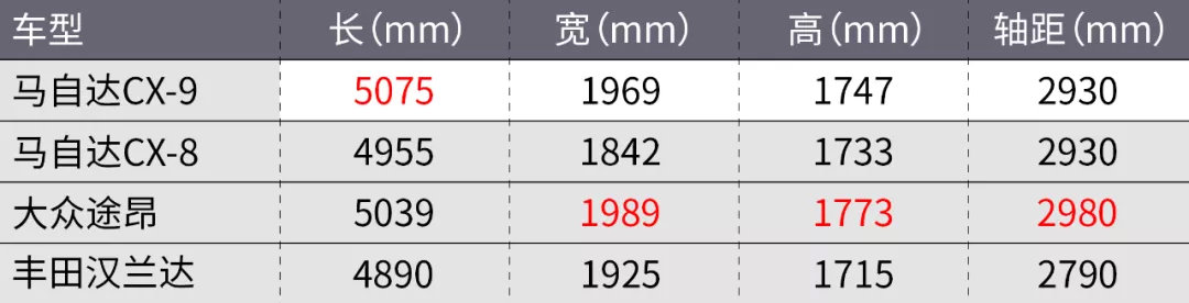 在尺寸方面,CX-9作为正宗的中大型SUV,车长接近5.1米,车身宽度也达到1969mm,相比CX-8的瘦长风格要更加魁梧,即使对比大众途昂也不落下风。可以看到,CX-8作为一款中大型SUV,它的车身宽度只有1842mm,比竞争对手要窄很多,与自家小弟CX-5保持一致。