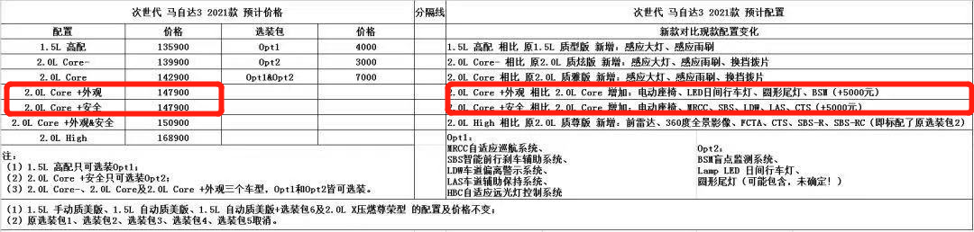从曝光的表格可以看出,2021款马自达3“配置”栏中所列举的1.5L高配、2.0L Core-、2.0LCore分别对应2020款马自达1.5L自动质型版、2.0L质炫版、2.0L质雅版。