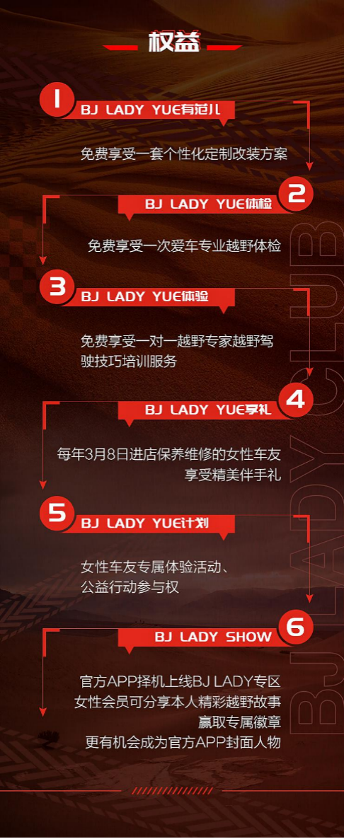 从另一个角度来说,组建BJ LADY CLUB对于女性车友多了一个交流平台,女性之间可以取得最直接的联系,就需求点和话题可以放松的聊到一起,轻松找到同好。 此外,在BJ LADY CLUB成立之际,北京越野还同时为女性车友带来了六项权益。(见下图)