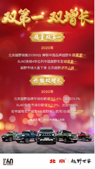 值得一提的是,2020年北京越野品牌更是在市场占有率上提高5.4%,达到23.1%;BJ40车型市场份额提高2.9%,达到19.6%。