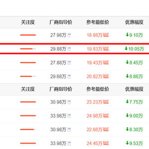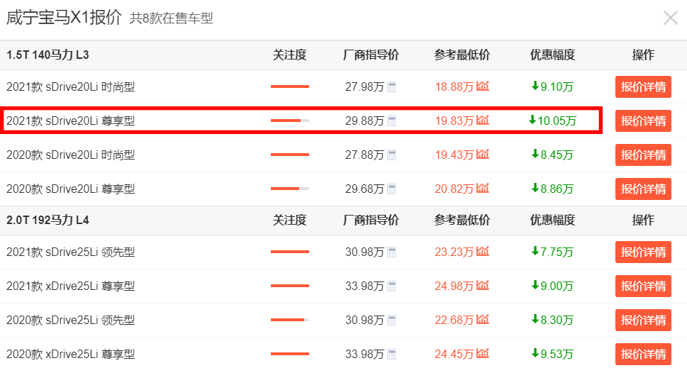 据前些日我从当地经销商所获得的情况来看,宝马X1目前已经成为了宝马SUV车型里优惠最大的一款车型。其在车主之家给出的报价信息中,已经从27.98-33.98万元的指导价来到了18.88-24.98万元的售价区间。终端最大优惠幅度可达10.05万元,入门版的最低配车型售价也已经来到了18.88万元左右。