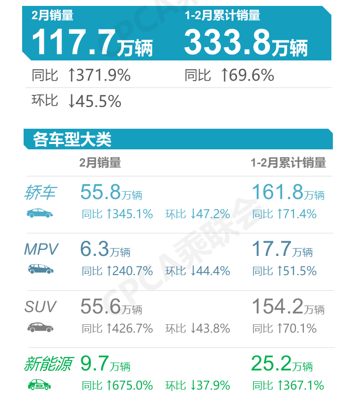 近日,中国汽车流通协会汽车市场研究分会(以下简称乘联会)公布了2月份汽车市场最新的零售销量数据统计。根据统计出的结果来看,2月份国内狭义乘用车市场销量达117.7万辆,同比增长371.9%,环比下降了45.5%。其中1-2月累计销量达333.8万辆,同比增长了69.6%。