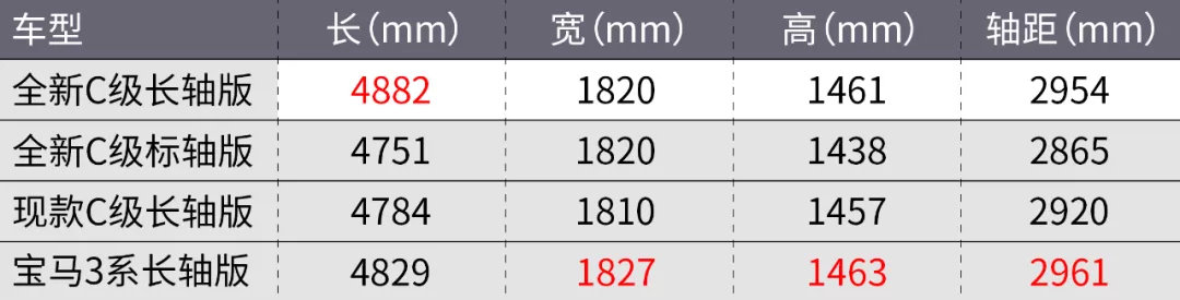 尺寸方面,全新C级国产版车型加长了89mm轴距,车身长度更是达到了夸张的4882mm,一跃超过3系成为BBA中型轿车里最长的一个。不过,全新C级在轴距方面尽管已经达到了2954mm,却依然比3系长轴版的2961mm要略短一些,不知道BBA的“加长战”要到何时才能休止呢?