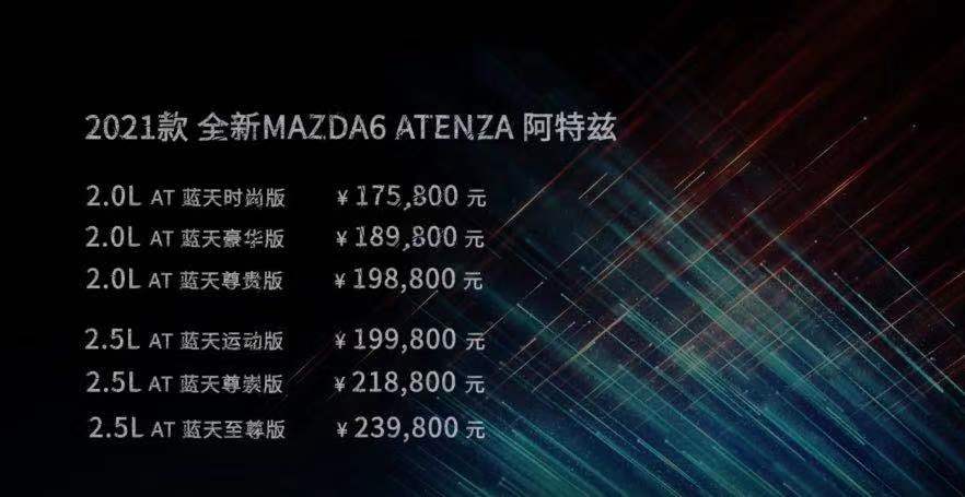 动力方面,2021款阿特兹将提供2.0L/2.5L发动机可选,传动方面,与之匹配的是6挡手自一体变速箱。曾经以操控出名的阿特兹,如今新款的到来,你们期待吗?最后问题来了,你们觉得新款阿特兹上市以后,销量会不会上升呢?欢迎在下方留言探讨。(十八/编辑)