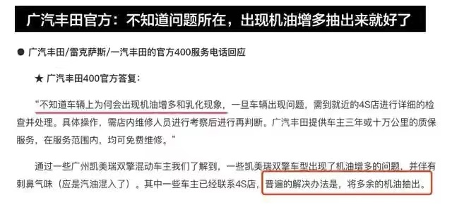文大力先生,作为现任广汽丰田执行副总经理,早前在广丰的主要工作是对内管理,安全生产/企业责任等方面,作为广丰体系内的资深“老人”,不知道对于广丰旗下车型出现的问题如何看待?之前的凯美瑞大面积爆发机油增多问题,或许是舆论声太大,所以广汽丰田才发布了官方通告。但是,处理的结果却并不是令人很满意,给出的解决办法就是将多余的机油抽出,难不成车主高高兴兴买了一台凯美瑞,除了日常需要去加油站加油以外,顺便还要偶尔去4S店抽机油?