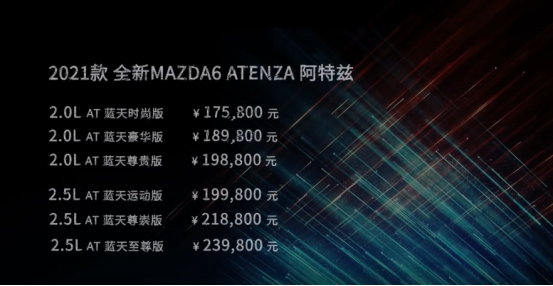 3月12日,2121款阿特兹正式上市。新车定价为 17.58-23.98万!