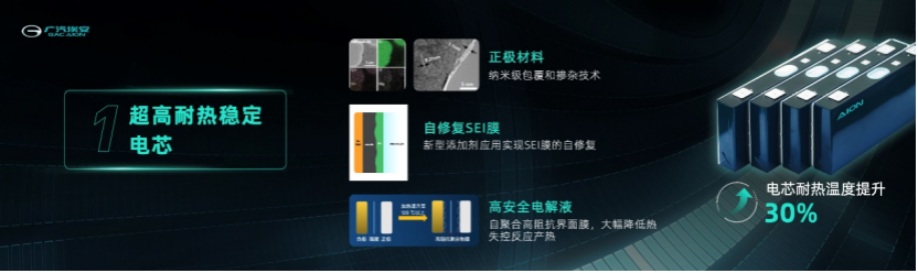 第一个就是超高耐热稳定的电芯,通过正极材料的纳米级包覆及掺杂技术的应用,电解液新型添加剂的应用实现了SEI膜的自修复,高安全电解液使电芯的耐热温度提升了30%。