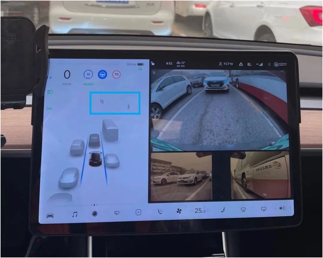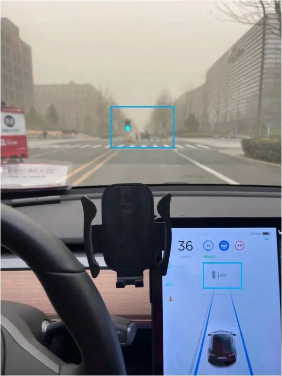即使能见度不高的情况下,Autopilot还是可以清晰的分辨出车道线、周围车辆、甚至是在我的视角都看不到的红绿灯。同时保持开启状态。