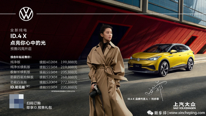 近日,上汽大众宣布ID.4 X (配置|询价)将于3月底正式上市交付,即日起消费者可以正式签署上汽大众ID.4 X购车合同。同时,新增了劲能四驱抢鲜版,NEDC续航里程520KM,综合补贴后售价268,888元,全系共6款车型,续航里程分别为402KM、520KM和555KM,起售价198888元。