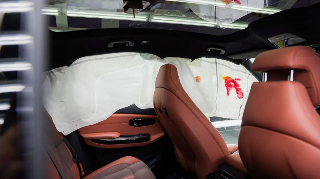 有意思的一点是,蔚来EC6的副驾驶正面气囊并不是像其它车型那样布置在仪表台上,而是放在了车顶遮阳板的位置。这样做主要是因为蔚来旗下的车型都有副驾驶女王座椅,当副驾驶以半躺状态乘车时,传统的正面气囊并不能有效地保护乘客的安全,因此才有了放在车顶的正面气囊。