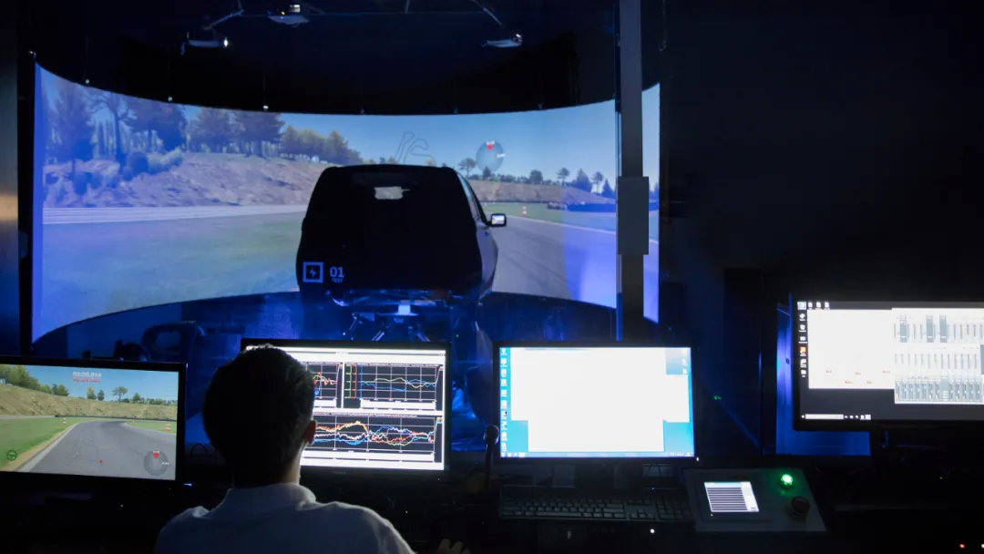 而整个蔚来嘉定区第二实验室的核心,就是这个9自由度驾驶模拟器了。这套设备可以在整车研发的初期阶段,模拟出车辆模型的底盘、驱动、轮胎等各个行走部件的性能,通过底部台架多个液压机构模拟出车辆真实行驶时的车身姿态变化。