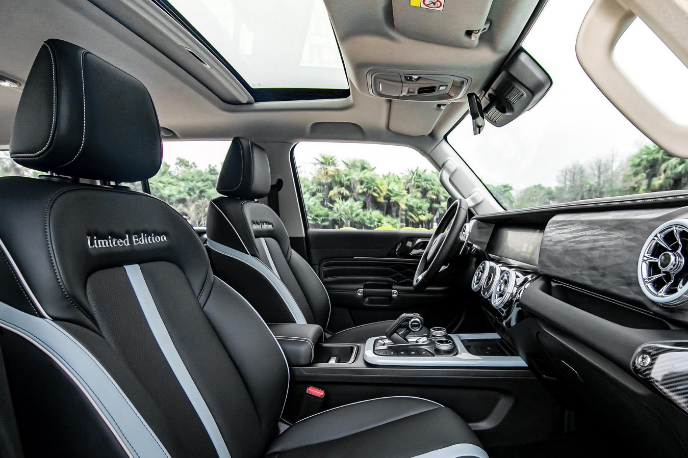 和造型相同的是,纯黑色的内饰同样加入了蓝色元素设计点缀,比如在圆形通风口、挡杆四周以及座椅表面,座椅靠背上还增加了限量版专属刺绣徽章。