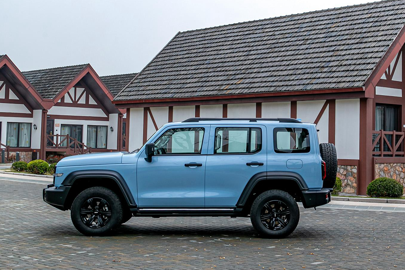 车身侧面用上了梯形轮眉设计,并且大幅向外突出,能容纳大尺寸的越野轮胎,也能起到防小磕碰的效果。车身尺寸上,长宽高分别4760/1930/1927mm,轴距为2750mm,并配备17英寸黑色涂装轮圈。