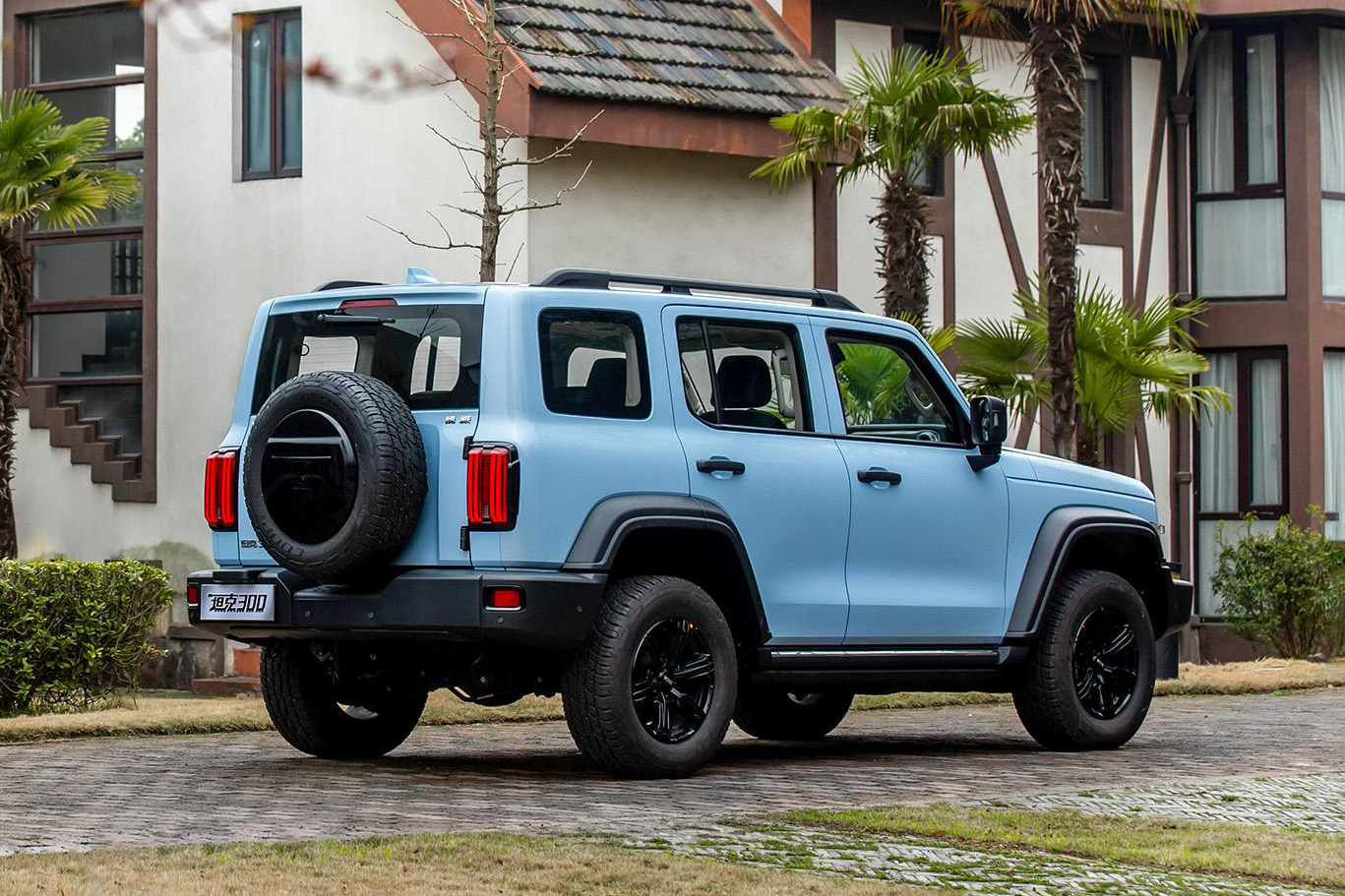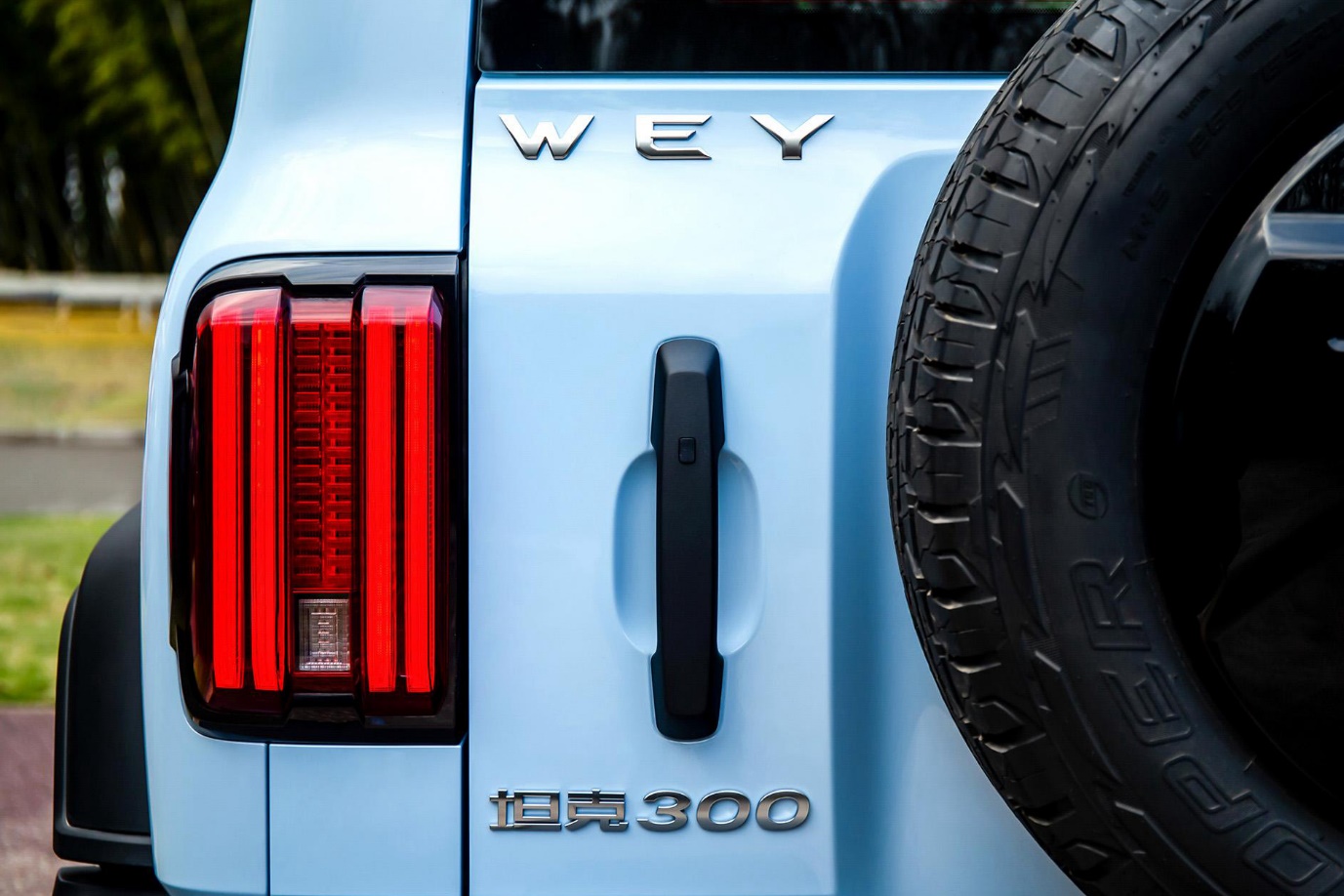 尾部设计同方方正正,尾门为横开式设计,外挂式备胎的"小书包"设计看起来复古硬派。尾灯采用方形小圆角设计,内置灯条竖向排列,与头灯形成横竖搭配。